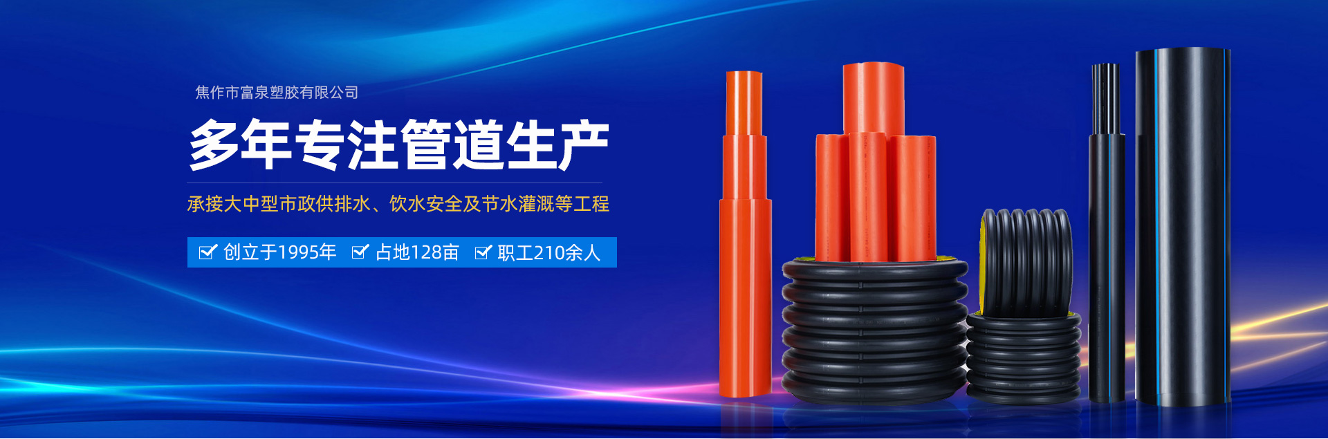 焦作市富泉塑胶有限公司,创立于1995年,是一家集研发、设计、生产、销售为一体的大型管材企业。公司位于太极故里、黄河之滨一一河南焦作温县。公司占地128亩,现有职工210余人,其中具有中技术职称的19人。生产、检验设备58台(套),包括PVC实壁管生产线11套、PE实壁管生产线12套、HDPE双壁波纹管生产线6套、PVC双壁波纹管生产线5套,检验设备14台(套)。主要产品有:Φ20mm-630mm、各种压力规格的PVCU、PVC-M、PE给水管材,PVC-U节水灌溉管材,HDPE燃气和矿用管材,DN200-800mm的HDPE、PVC双壁波纹管及各种喷灌、滴灌工程材料。承接大中型市政供排水、饮水安全及节水灌溉等工程。  富泉塑胶公司重视产品的质量、安全、环保和节能,在同行业中率先完成了“新华节水产品认证”,全方面通过ISO9001:2008国际质量管理体系、IS014001:2004环境管理体系和OHSAS18001职业健康安全管理体系的一体化导入,并建立起规范的现代企业管理体系。公司以“质量”为先导,采用质量跟踪、多环节把关的方法,组建具有行业水准的企业技术检测中心,常年委托水利部节水灌溉设备检测中心、河南省产品质量监督检验院对产品跟踪检测,并由中国人民保险公司承保产品质量。公司连续多年被河南省水利厅确定为“安全饮水设备、节水灌溉设备”定点生产企业,并获得“中国名优产品”“质量、服务、信誉AAA企业”“河南省**产品”“河南省水利企业”“河南省守合同、重信用企业”等荣誉称号。  富泉塑胶公司坚持“用户为上”的服务理念,长期以来,全方面关注客户价值,不断提升服务水平。服务队伍常年为客户的产品设计、施工、安装提供合理的方案和全程细致、周到、**、快捷的技术服务。公司自成立以来,一直坚持以人为本的宗旨,塑造企业形象,并致力于新产品的开发,凭借雄厚的技术开发能力,先进的工艺制造流程,严格的质量管理保证体系,优良的售后服务网络,已成为河南省大的饮水、灌溉及排水管材设备制造商。产品畅销全国,而且还以公司雄厚的综合实力在业界中占据着重要的地位。